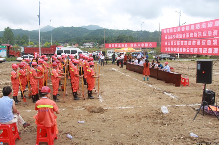 76上午,一场带实战性质的防汛抢险演练在318国道英山境内举行。应急演练背景假设为当日凌晨,黄冈北部山区突降大雨,英山县公路局鸭掌树公路管理站养护工人巡查时发现318国道英山县境内K720+100处凶猛的山洪已将公路一侧的路基冲毁,冲毁长度达10米,泥石流导致山体坍塌造成道路堵塞,情况十分危急。